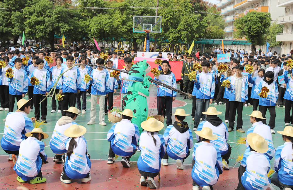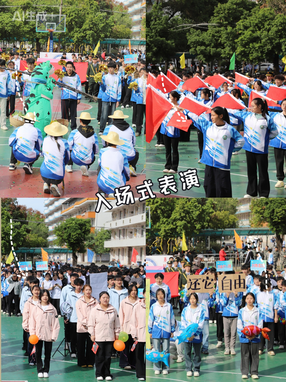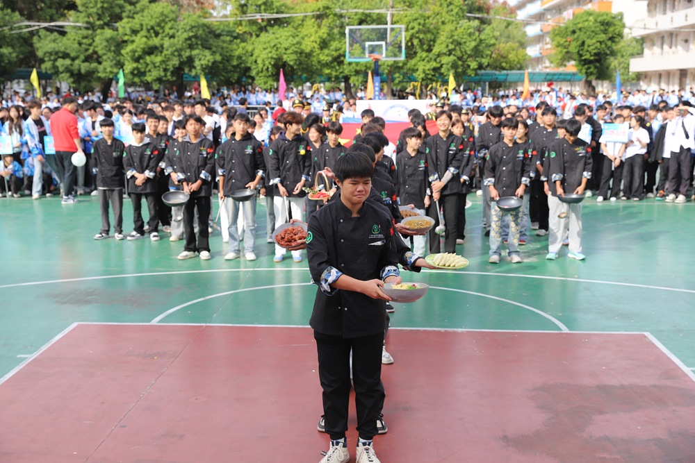 开幕式上,国旗队、校旗队、会徽队、鲜花队依次入场。随后,来自八步校区的70多个班级方阵身着统一服饰,手举融合专业特色与创意巧思的道具,精神抖擞、口号嘹亮,昂首入场,尽显青春风采与昂扬斗志。在展示区,他们将专业特色、爱国情怀、服务“三农”初心与民族文化元素巧妙融入一分钟主题表演。中餐烹饪专业学子现场展示精湛厨艺,掂锅与摆盘尽显专业功底;幼儿保育专业学子跳起活力舞蹈,传递童真与爱心;电子商务专业学子模拟精彩直播,展现数智营销技能;智能网联汽车技术专业学子带来汽车模型演示,凸显专业特色;休闲农业生产与经营专业学子则通过模拟耕种、收割等农耕场景,传递农业劳作魅力。丰富多彩的表演,充分展现了农校学子的专业风采与青春活力,赢得现场阵阵掌声。