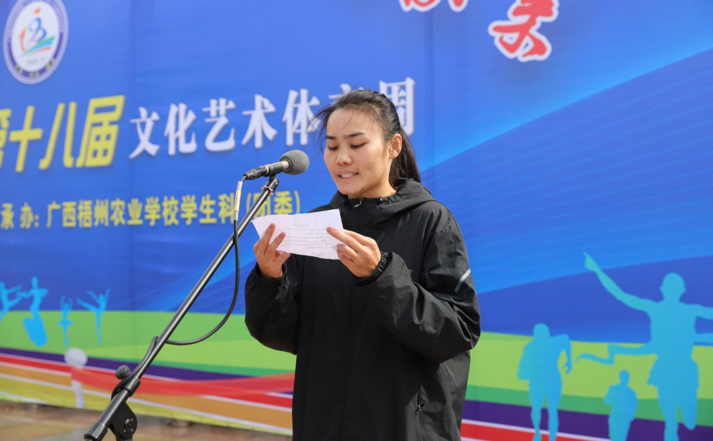 最后,叶继炎发表致辞。他在讲话中指出,体育不仅是竞技场上的较量,更是凝聚力量、锤炼品格的重要载体。他鼓励全体师生迎难而上、积极参与、团结协作、赛出精彩,并宣布广西梧州农业学校第十八届文化体育周暨第二十八届田径运动会正式开幕。