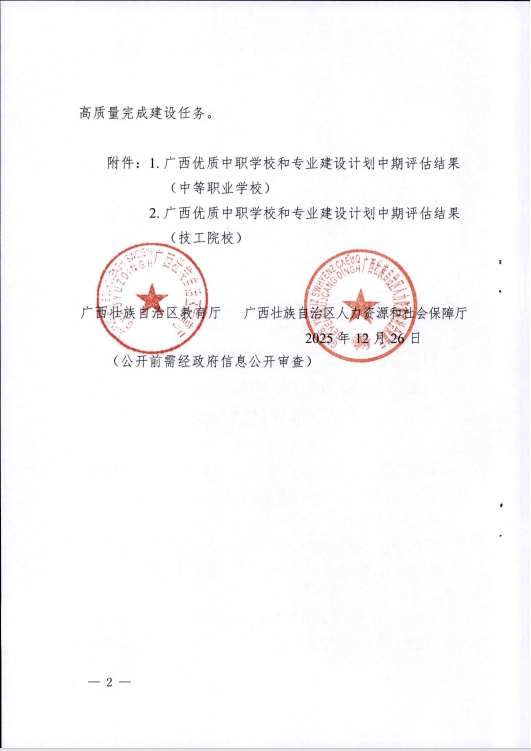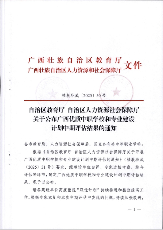 近日,广西壮族自治区教育厅、自治区人力资源社会保障厅联合公布《关于公布广西优质中职学校和专业建设计划中期评估结果的通知》,我校在广西优质中职学校和专业建设计划中期评估中荣获B类“优”级评估,展现出了扎实的建设成效和良好的发展态势。