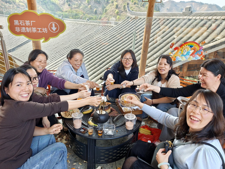 午后三时,邀友聚坐,围炉煮茶在茶园一角悄然展开。专业茶艺师以娴熟的手法展示六堡茶冲泡技艺,温杯、投茶、注水、出汤,一气呵成。教职工们一边品鉴六堡茶,一边学习品茶、识茶、鉴茶之法。茶香袅袅间,情谊在茶汤中悄然升温。