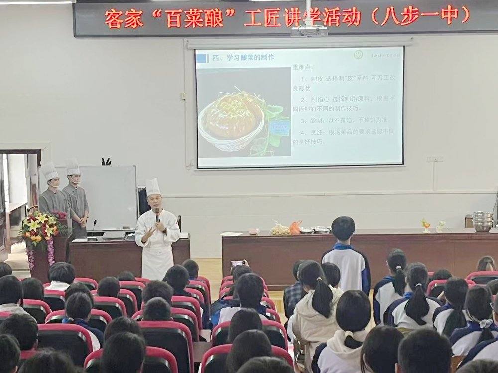 八步客家百菜酿是长寿贺州市客家饮食文化的标志性载体,以“逢菜必酿、万物可酿”为特色,涵盖百余种品类,承载着客家人数百年的迁徙记忆与饮食智慧。作为土生土长的贺州客家人,邱勇深耕客家菜技艺数十年,严守传统精髓,同时依托学校获自治区教育厅认定的广西长寿贺州客家菜示范性民族文化传承创新职业教育基地、贺州市东融名师邱勇技能大师工作室,将非遗技艺与职业教育深度融合。