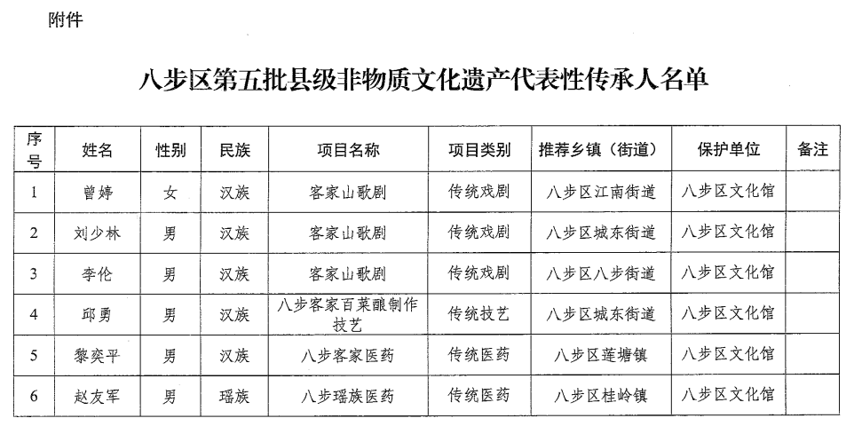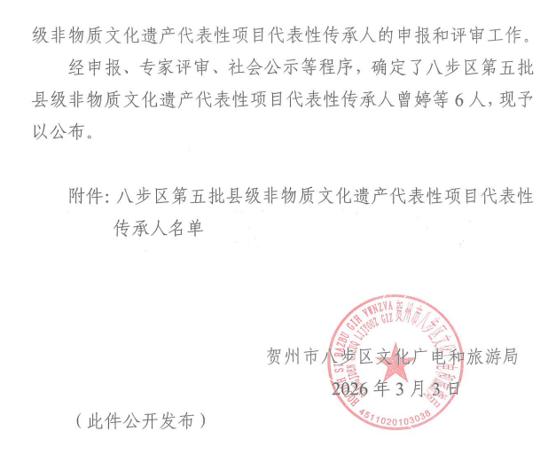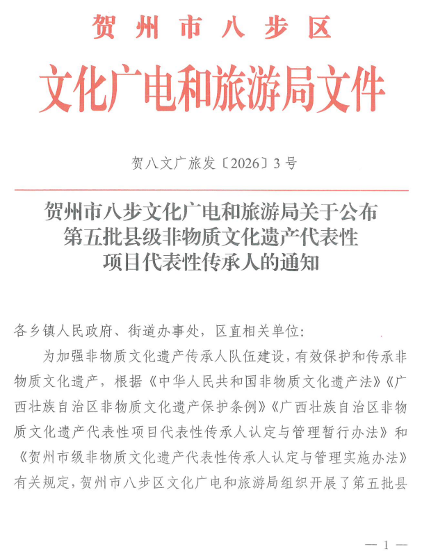 图为邱勇老师被认定为八步区县级非物质文化遗产代表性传承人的文件