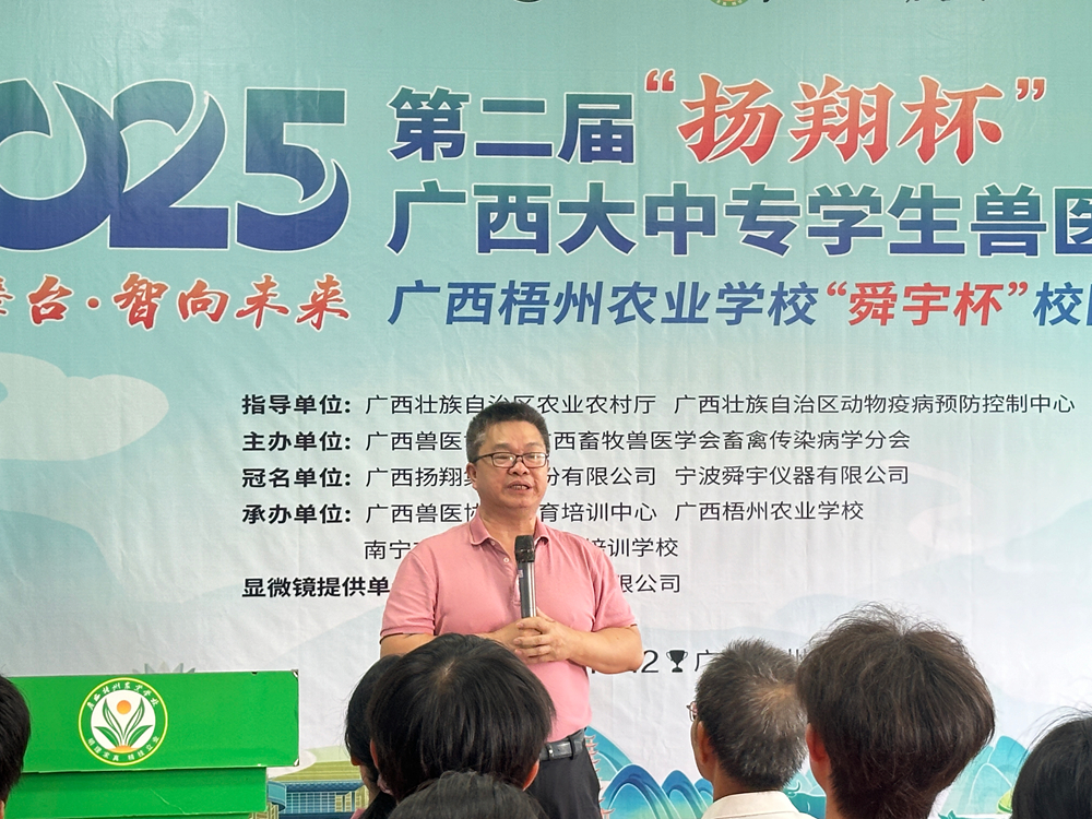 2025年10月12日,2025年第二届“扬翔杯”广西大中专学生兽医技能大赛——广西梧州农业学校“舜宇杯”校园选拔赛在该校信都校区成功举办。学校党总支委员、信都校区综合办主任陀立钧出席并致欢迎辞,广西兽医协会会长、广西大学博士生导师黄伟坚教授亲临指导并致开幕辞,以及支持单位宁波舜宇仪器有限公司华南区经理王东讲话。此外,一同出席活动的领导嘉宾还有广西兽医协会常务理事潘杰、副秘书长甘海霞和教育培训中心主管韦碧燕等,以及学校畜禽生产技术专业60多名师生代表。