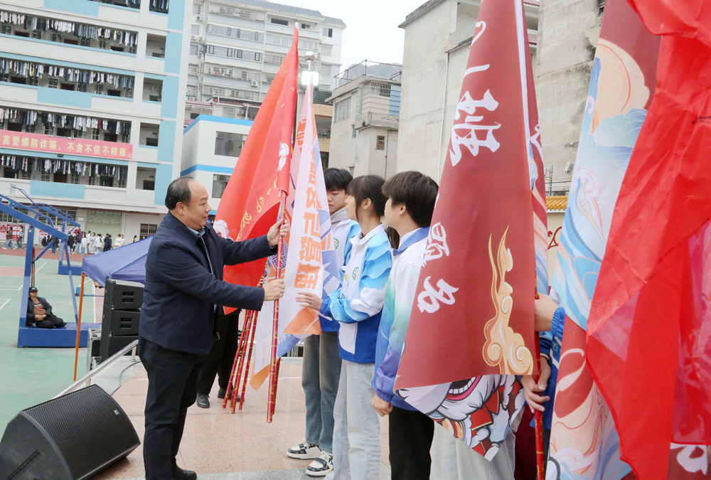 随后,学校领导为各班级授旗,给三年级学子鼓舞士气、传递信念,为备考之路点亮明灯。