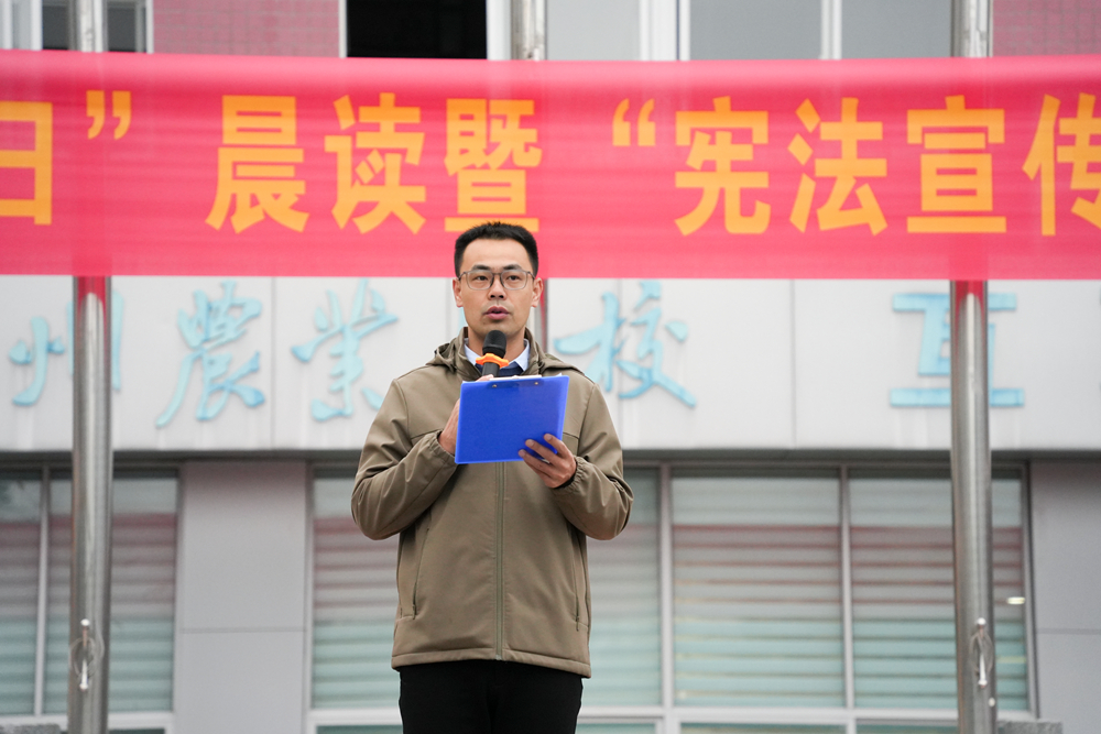活动在庄严的国歌声中拉开帷幕,全体师生肃立。学生科科长刘汉为活动作动员讲话。他强调了宪法作为国家根本大法的重要性,阐述了在新时代背景下青年学生弘扬宪法精神、增强法治观念的紧迫性与现实意义,并号召全体同学积极学法、自觉守法、善于用法,努力成长为具备优秀法治素养的新时代青年。讲话富有感召力,赢得了现场热烈的掌声。