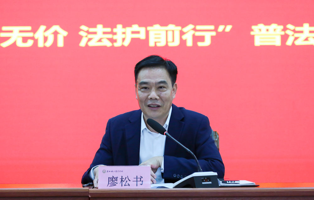 12月11日下午,我校特邀贺州市中级人民法院党组成员、副院长姚智文到校,开展以“青春无价 法护前行”为主题的普法课堂。学校各班级学生代表200余人参与法治教育。