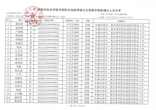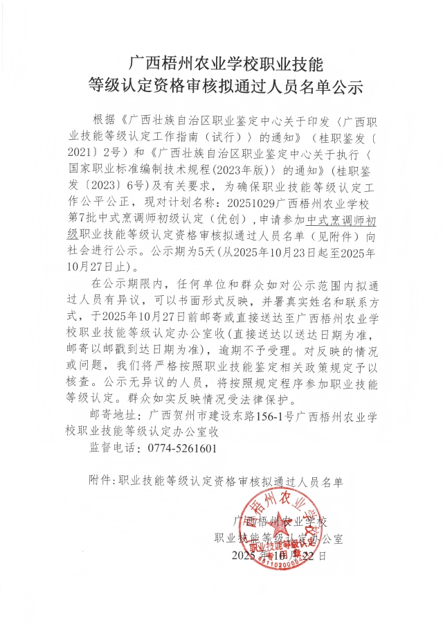 根据《广西壮族自治区职业鉴定中心关于印发〈广西职业技能等级认定工作指南(试行)〉的通知》(桂职鉴发〔2021〕2号)和《广西壮族自治区职业鉴定中心关于执行〈国家职业标准编制技术规程(2023年版)〉的通知》(桂职鉴发〔2023〕6号)及有关要求,为确保职业技能等级认定工作公平公正,现对计划名称:20251029广西梧州农业学校第7批中式烹调师初级认定(优创),申请参加中式烹调师初级职业技能等级认定资格审核拟通过人员名单(见附件)向社会进行公示。公示期为5天(从2025年10月23日起至2025年10月27日止)。
