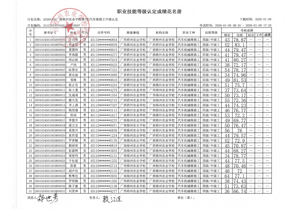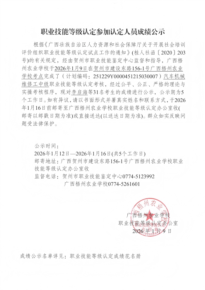 根据《广西壮族自治区人力资源和社会保障厅关于开展社会培训评价组织职业技能等级认定试点工作的通知》(桂人社函〔2020〕203号)的有关规定,经由贺州市职业技能鉴定中心监督和指导,广西梧州农业学校于2026年1月9日在贺州市建设东路156-1号广西梧州农业学校考点完成了(计划编码:251229Y0000451215030007)汽车机械维修工中级职业技能等级认定考核,经过公平、公正、严格的理论与实操考核程序,现对李启海等31名考生的成绩进行公示,公示期为5个工作日。如有异议,请以书面形式并署真实姓名和联系方式,于2026年1月16日前邮寄至广西梧州农业学校职业技能等级认定办公室收(邮寄以邮戳日期为准)或直接送达(以送达日期为准)。群众如实反映问题受法律保护。