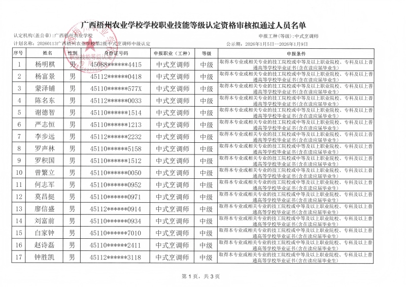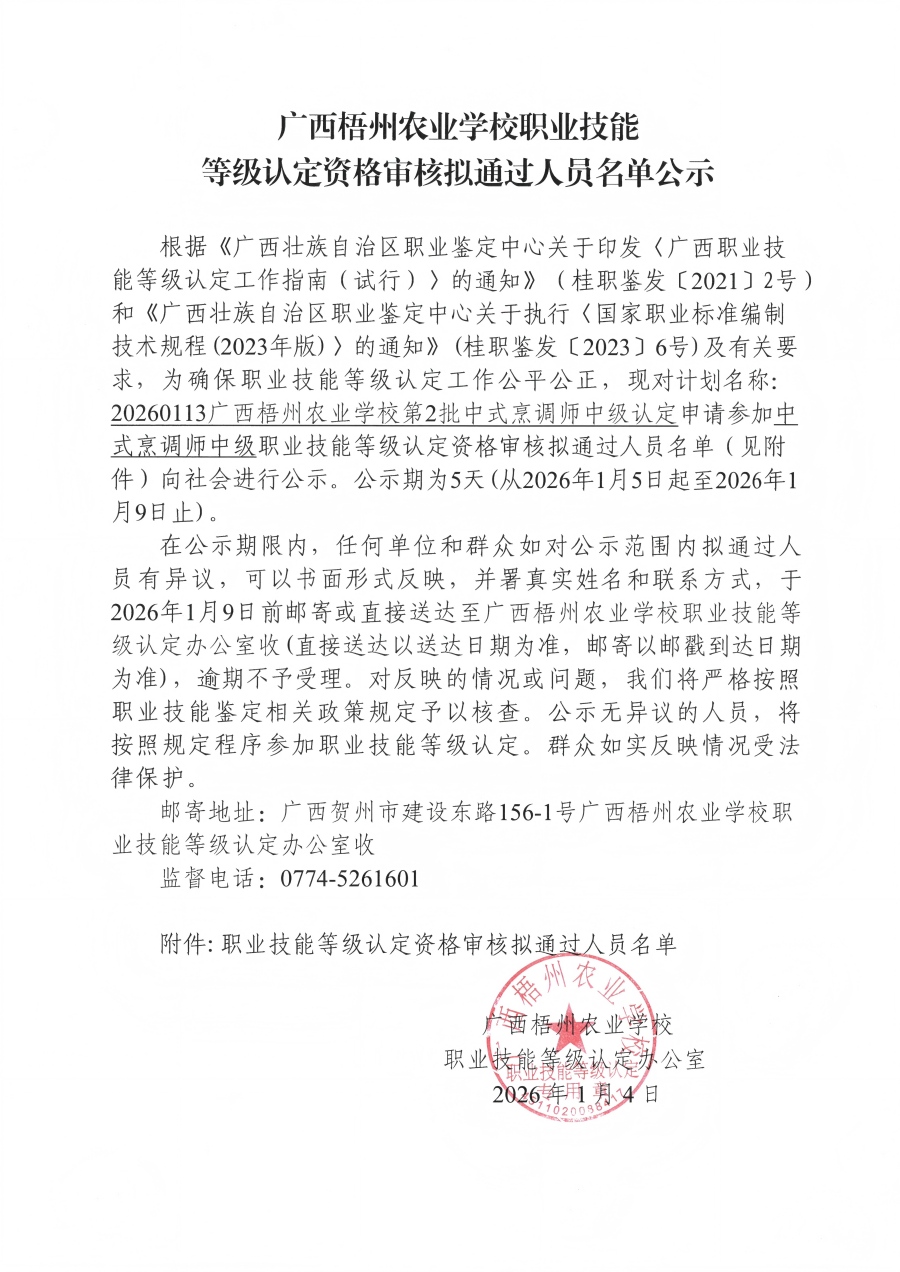 根据《广西壮族自治区职业鉴定中心关于印发〈广西职业技能等级认定工作指南(试行)〉的通知》(桂职鉴发〔2021〕2号)和《广西壮族自治区职业鉴定中心关于执行〈国家职业标准编制技术规程(2023年版)〉的通知》(桂职鉴发〔2023〕6号)及有关要求,为确保职业技能等级认定工作公平公正,现对计划名称:20260113广西梧州农业学校第2批中式烹调师中级认定申请参加中式烹调师中级职业技能等级认定资格审核拟通过人员名单(见附件)向社会进行公示。公示期为5天(从2026年1月5日起至2026年1月9日止)。