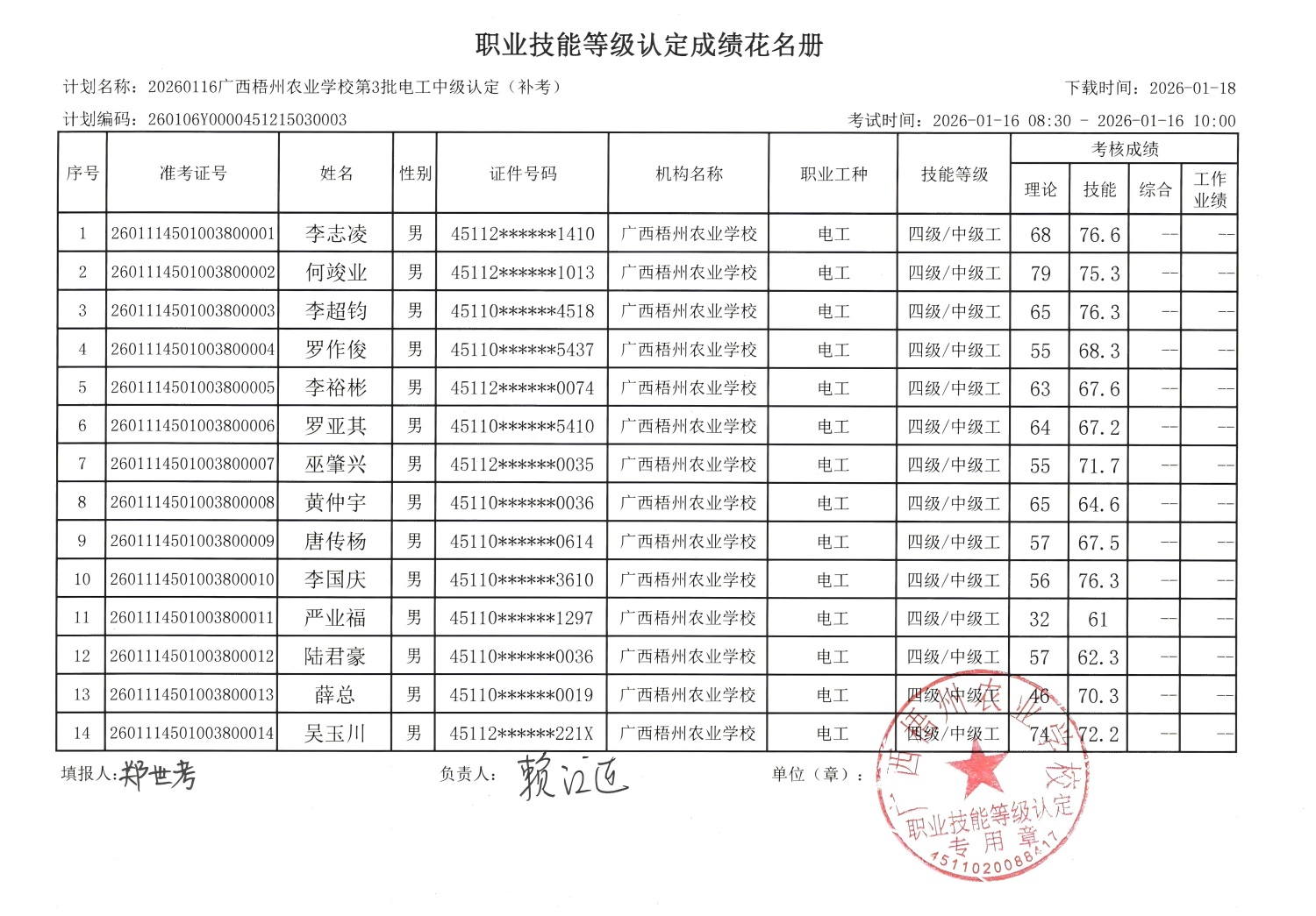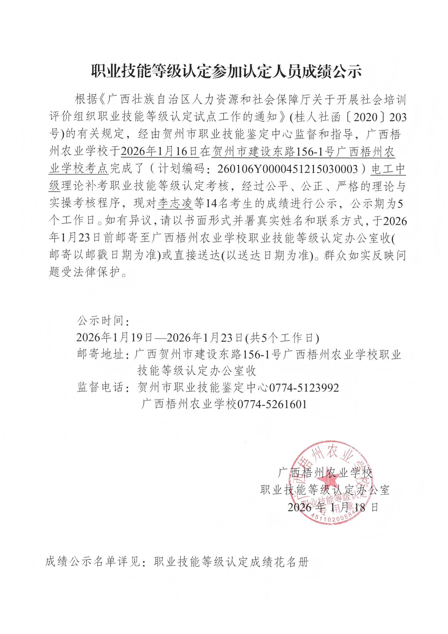 根据《广西壮族自治区人力资源和社会保障厅关于开展社会培训评价组织职业技能等级认定试点工作的通知》(桂人社函〔2020〕203号)的有关规定,经由贺州市职业技能鉴定中心监督和指导,广西梧州农业学校于2026年1月16日在贺州市建设东路156-1号广西梧州农业学校考点完成了(计划编码:260106Y0000451215030003)电工中级理论补考职业技能等级认定考核,经过公平、公正、严格的理论与实操考核程序,现对李志凌等14名考生的成绩进行公示,公示期为5个工作日。如有异议,请以书面形式并署真实姓名和联系方式,于2026年1月23日前邮寄至广西梧州农业学校职业技能等级认定办公室收(邮寄以邮戳日期为准)或直接送达(以送达日期为准)。群众如实反映问题受法律保护。