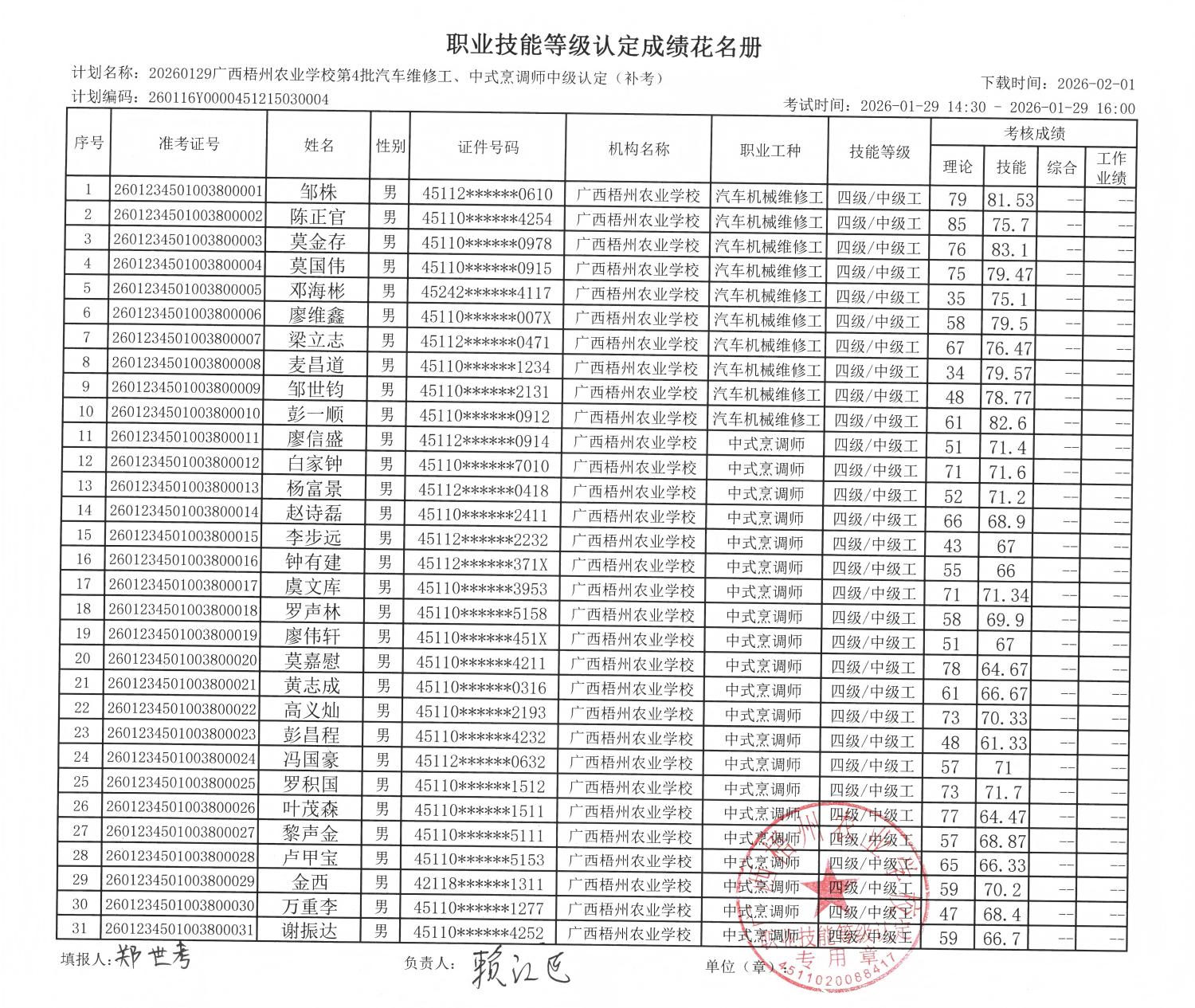 根据《广西壮族自治区人力资源和社会保障厅关于开展社会培训评价组织职业技能等级认定试点工作的通知》(桂人社函〔2020〕203号)的有关规定,经由贺州市职业技能鉴定中心监督和指导,广西梧州农业学校于2026年1月29日在贺州市建设东路156-1号广西梧州农业学校考点完成了(计划编码:260116Y0000451215030004)汽车机械维修工、中式烹调师中级理论补考职业技能等级认定考核,经过公平、公正、严格的理论与实操考核程序,现对邹株等31名考生的成绩进行公示,公示期为5个工作日。如有异议,请以书面形式并署真实姓名和联系方式,于2026年2月6日前邮寄至广西梧州农业学校职业技能等级认定办公室收(邮寄以邮戳日期为准)或直接送达(以送达日期为准)。群众如实反映问题受法律保护。
