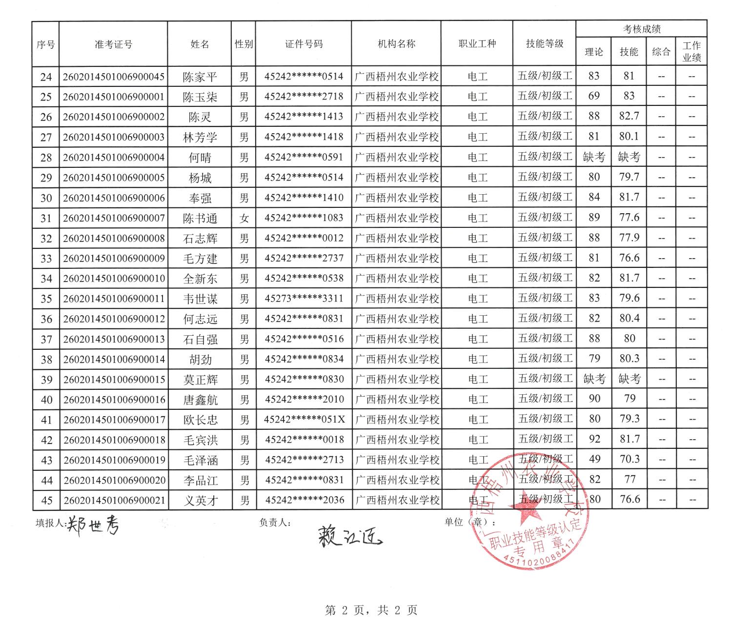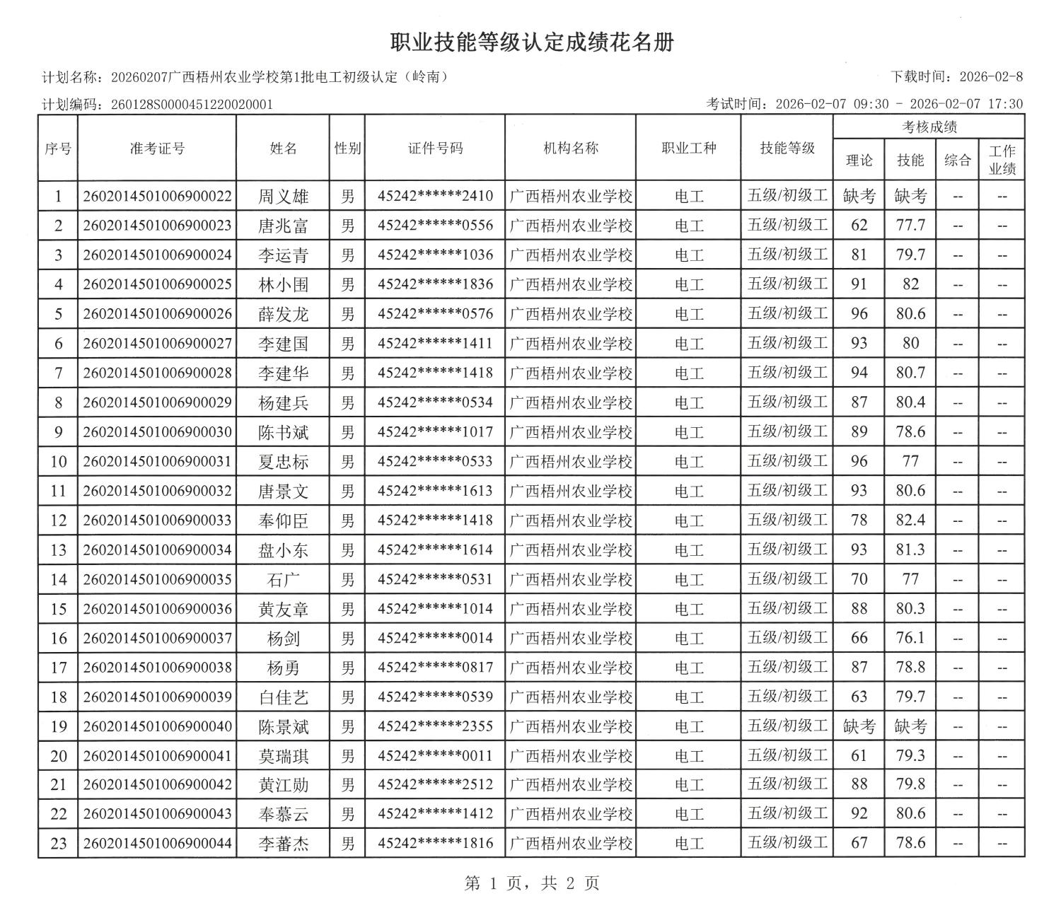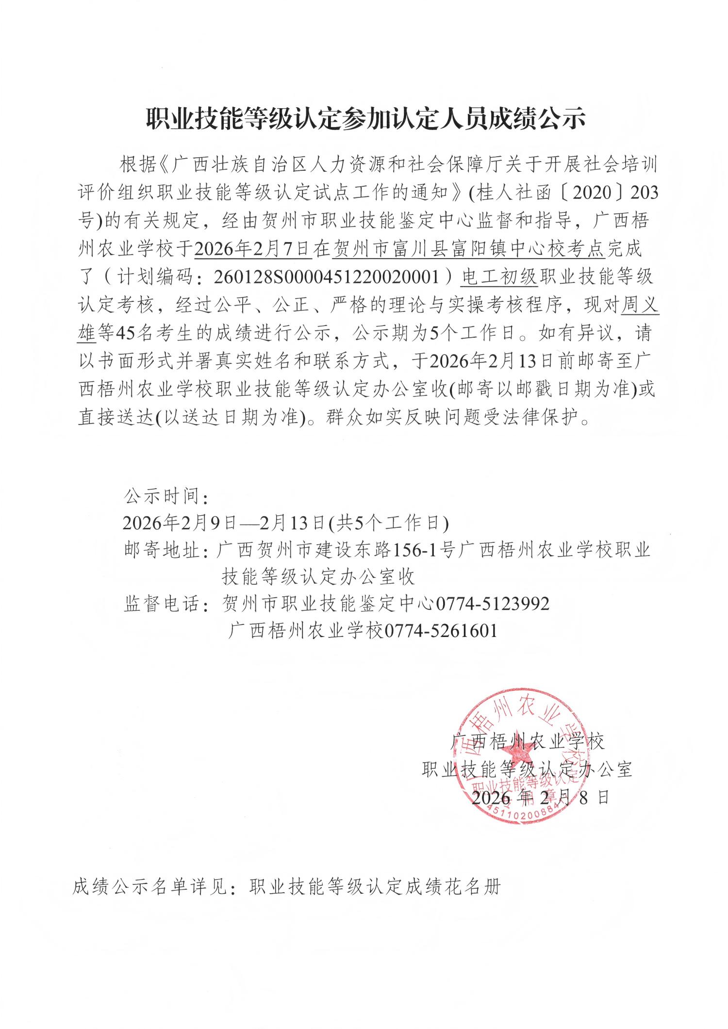根据《广西壮族自治区人力资源和社会保障厅关于开展社会培训评价组织职业技能等级认定试点工作的通知》(桂人社函〔2020〕203号)的有关规定,经由贺州市职业技能鉴定中心监督和指导,广西梧州农业学校于2026年2月7日在贺州市富川县富阳镇中心校考点完成了(计划编码:260128S0000451220020001)电工初级职业技能等级认定考核,经过公平、公正、严格的理论与实操考核程序,现对周义雄等45名考生的成绩进行公示,公示期为5个工作日。如有异议,请以书面形式并署真实姓名和联系方式,于2026年2月13日前邮寄至广西梧州农业学校职业技能等级认定办公室收(邮寄以邮戳日期为准)或直接送达(以送达日期为准)。群众如实反映问题受法律保护。