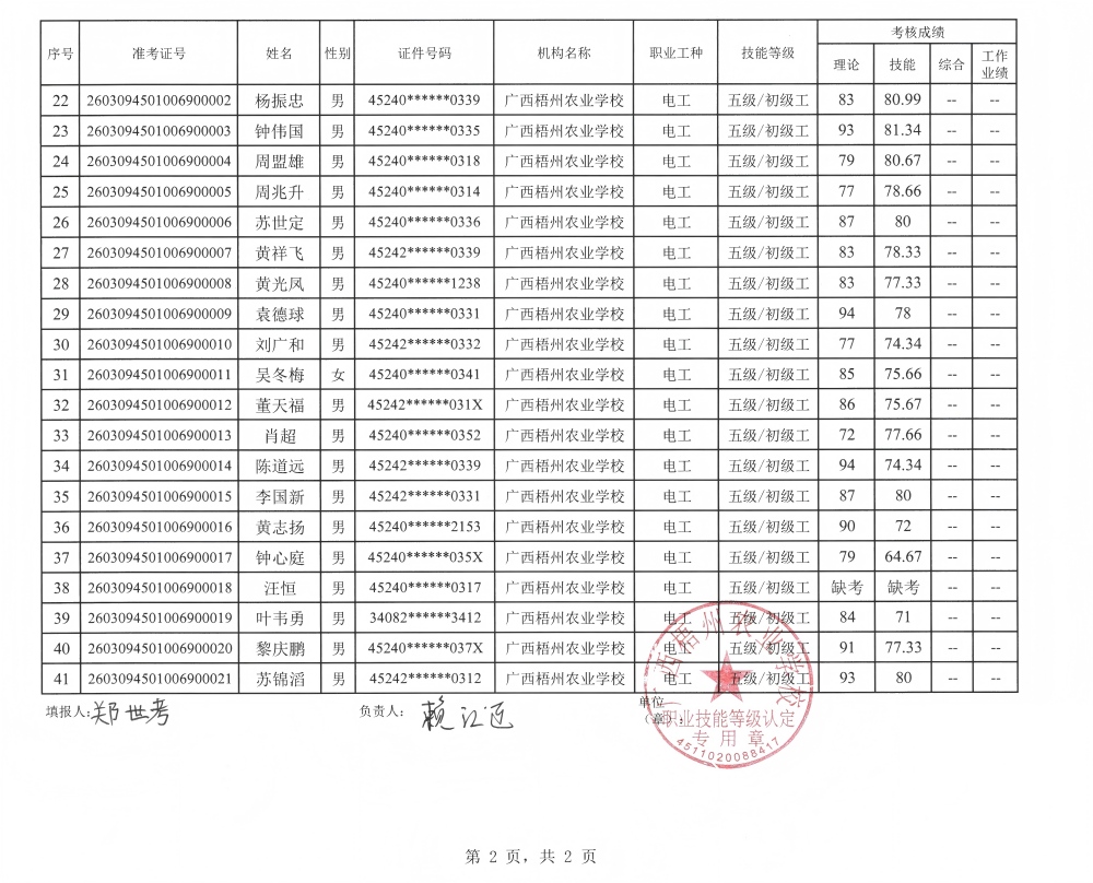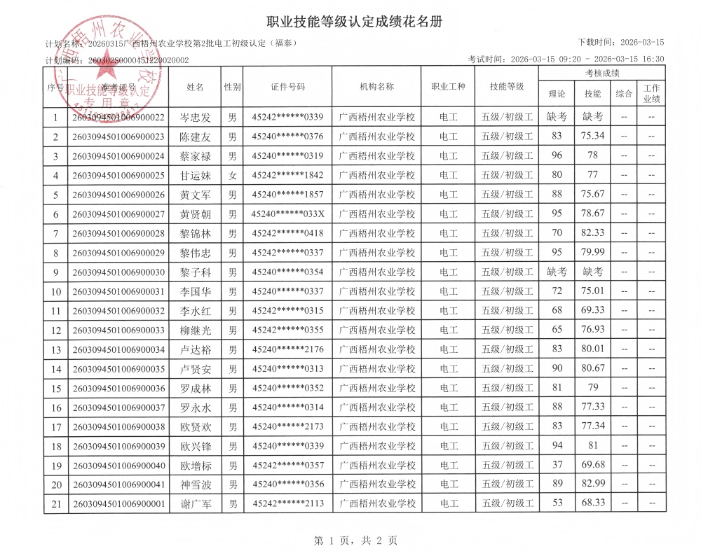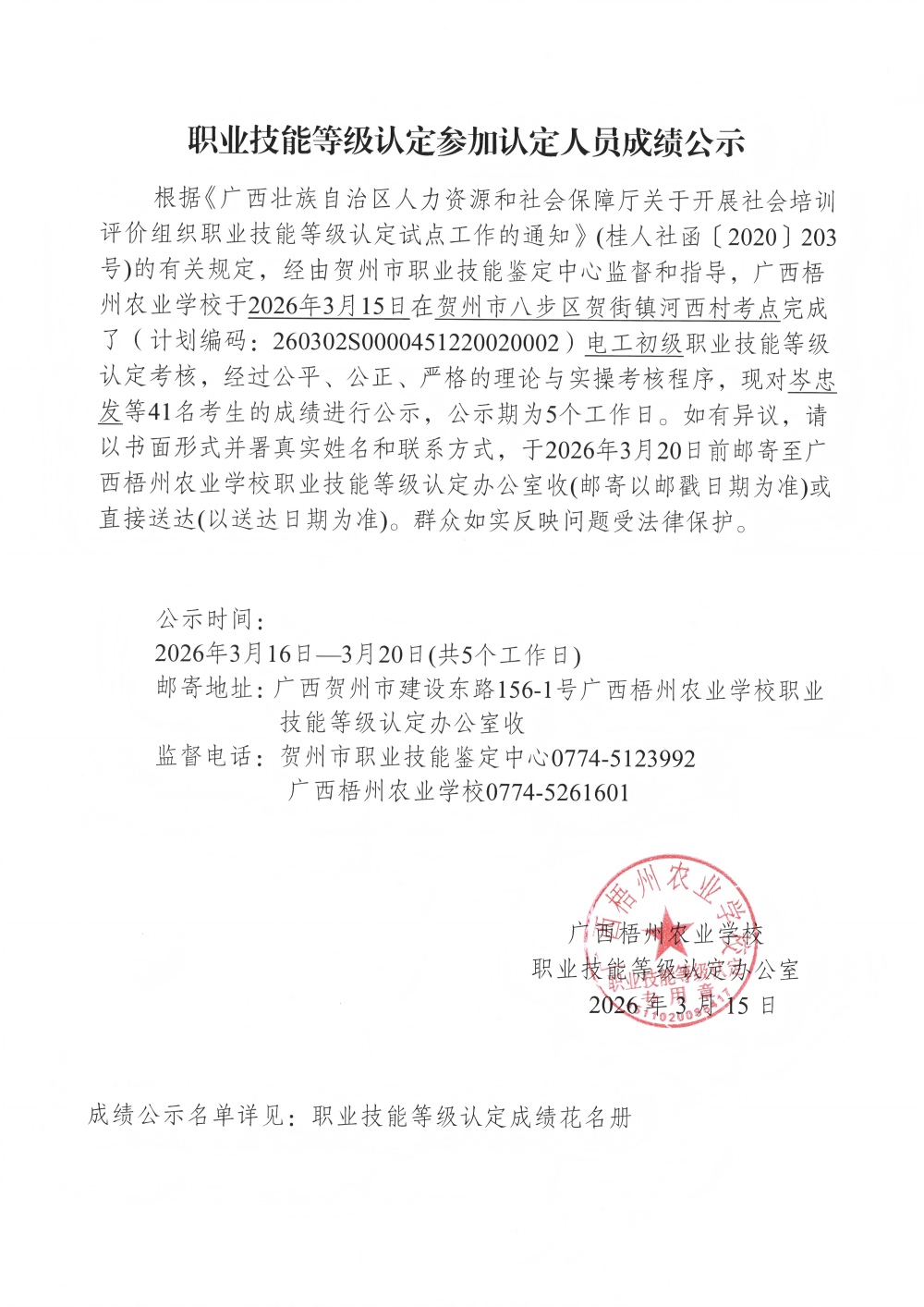 根据《广西壮族自治区人力资源和社会保障厅关于开展社会培训评价组织职业技能等级认定试点工作的通知》(桂人社函〔2020〕203号)的有关规定,经由贺州市职业技能鉴定中心监督和指导,广西梧州农业学校于2026年3月15日在贺州市八步区贺街镇河西村考点完成了(计划编码:260302S0000451220020002)电工初级职业技能等级认定考核,经过公平、公正、严格的理论与实操考核程序,现对岑忠发等41名考生的成绩进行公示,公示期为5个工作日。如有异议,请以书面形式并署真实姓名和联系方式,于2026年3月20日前邮寄至广西梧州农业学校职业技能等级认定办公室收(邮寄以邮戳日期为准)或直接送达(以送达日期为准)。群众如实反映问题受法律保护。