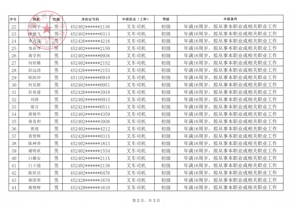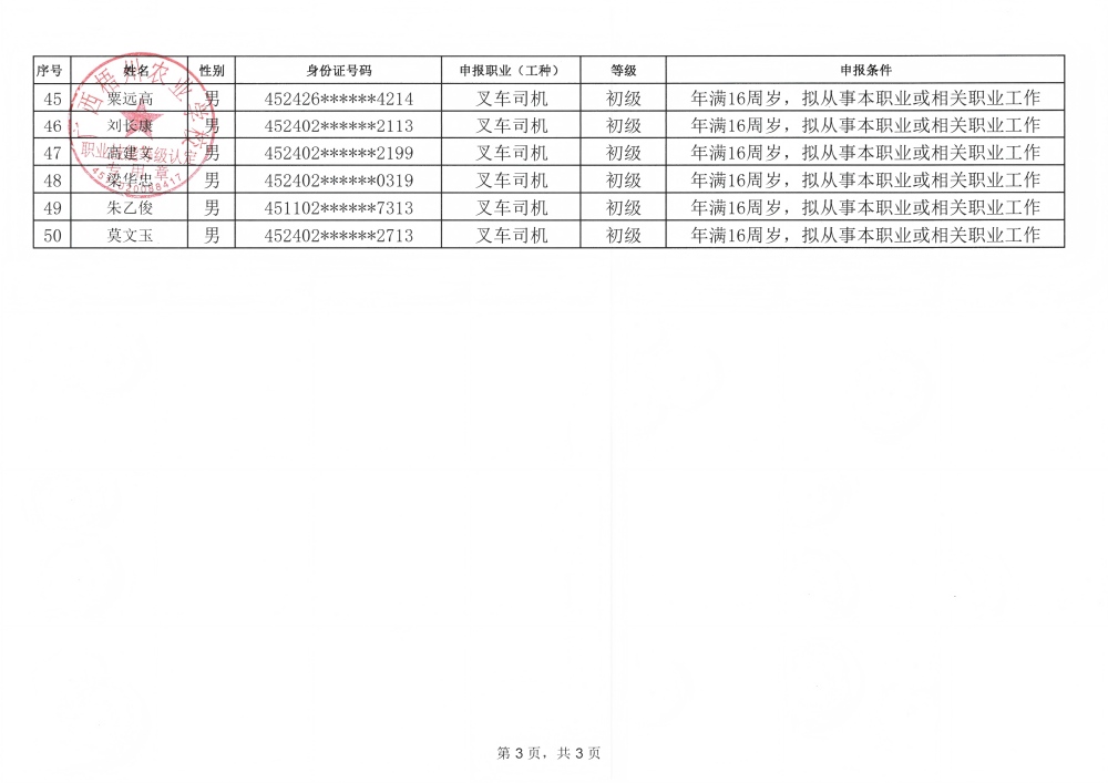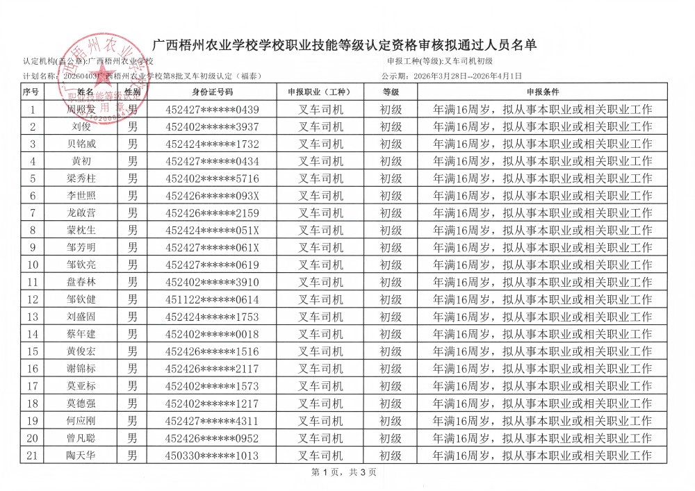 根据《广西壮族自治区职业鉴定中心关于印发〈广西职业技能等级认定工作指南(试行)〉的通知》(桂职鉴发〔2021〕2号)和《广西壮族自治区职业鉴定中心关于执行〈国家职业标准编制技术规程(2023年版)〉的通知》(桂职鉴发〔2023〕6号)及有关要求,为确保职业技能等级认定工作公平公正,现对计划名称:20260403广西梧州农业学校第8批叉车初级认定(福泰)申请参加叉车司机初级职业技能等级认定资格审核拟通过人员名单(见附件)向社会进行公示。公示期为5天(从2026年3月28日起至2026年4月1日止)。