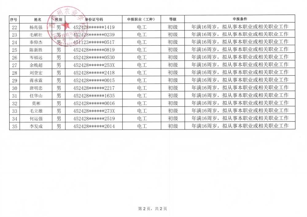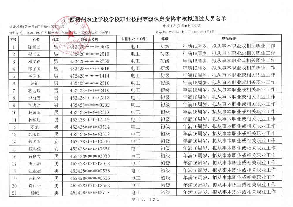 根据《广西壮族自治区职业鉴定中心关于印发〈广西职业技能等级认定工作指南(试行)〉的通知》(桂职鉴发〔2021〕2号)和《广西壮族自治区职业鉴定中心关于执行〈国家职业标准编制技术规程(2023年版)〉的通知》(桂职鉴发〔2023〕6号)及有关要求,为确保职业技能等级认定工作公平公正,现对计划名称:20260402广西梧州农业学校第7批电工初级认定(兴华)申请参加电工初级职业技能等级认定资格审核拟通过人员名单(见附件)向社会进行公示。公示期为5天(从2026年3月28日起至2026年4月1日止)。