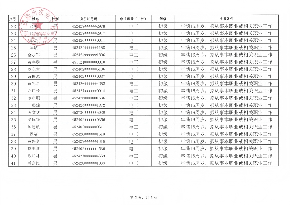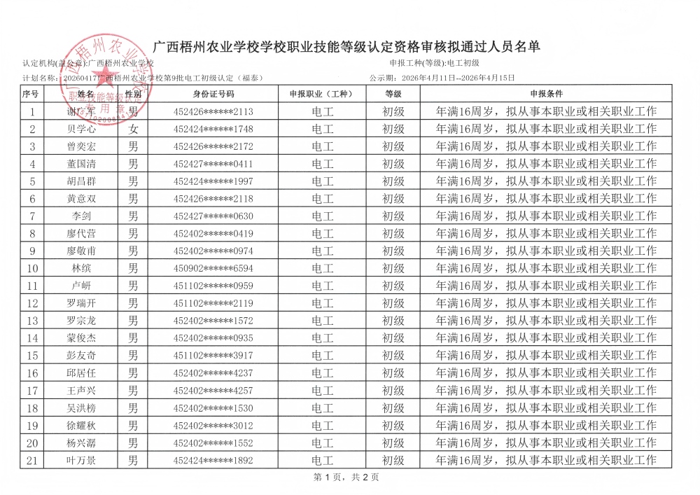 根据《广西壮族自治区职业鉴定中心关于印发〈广西职业技能等级认定工作指南(试行)〉的通知》(桂职鉴发〔2021〕2号)和《广西壮族自治区职业鉴定中心关于执行〈国家职业标准编制技术规程(2023年版)〉的通知》(桂职鉴发〔2023〕6号)及有关要求,为确保职业技能等级认定工作公平公正,现对计划名称:20260417广西梧州农业学校第9批电工初级认定(福泰)申请参加电工初级职业技能等级认定资格审核拟通过人员名单(见附件)向社会进行公示。公示期为5天(从2026年4月11日起至2026年4月15日止)。