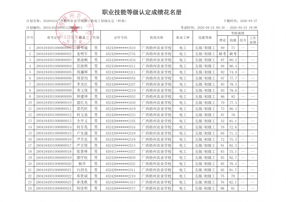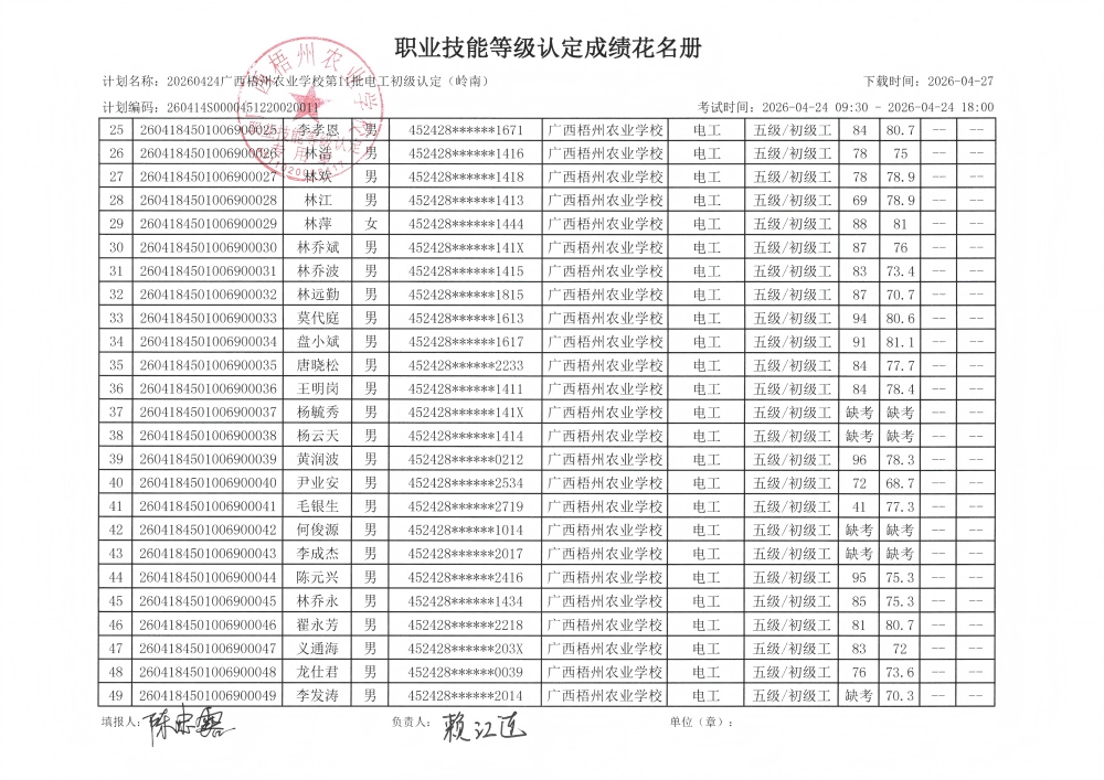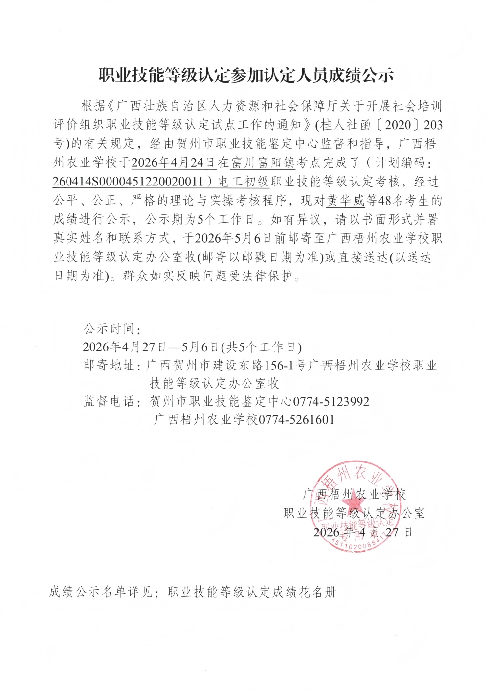 根据《广西壮族自治区人力资源和社会保障厅关于开展社会培训评价组织职业技能等级认定试点工作的通知》(桂人社函〔2020〕203号)的有关规定,经由贺州市职业技能鉴定中心监督和指导,广西梧州农业学校于2026年4月24日在富川富阳镇考点完成了(计划编码:260414S0000451220020011)电工初级职业技能等级认定考核,经过公平、公正、严格的理论与实操考核程序,现对黄华威等48名考生的成绩进行公示,公示期为5个工作日。如有异议,请以书面形式并署真实姓名和联系方式,于2026年5月6日前邮寄至广西梧州农业学校职业技能等级认定办公室收(邮寄以邮戳日期为准)或直接送达(以送达日期为准)。群众如实反映问题受法律保护。